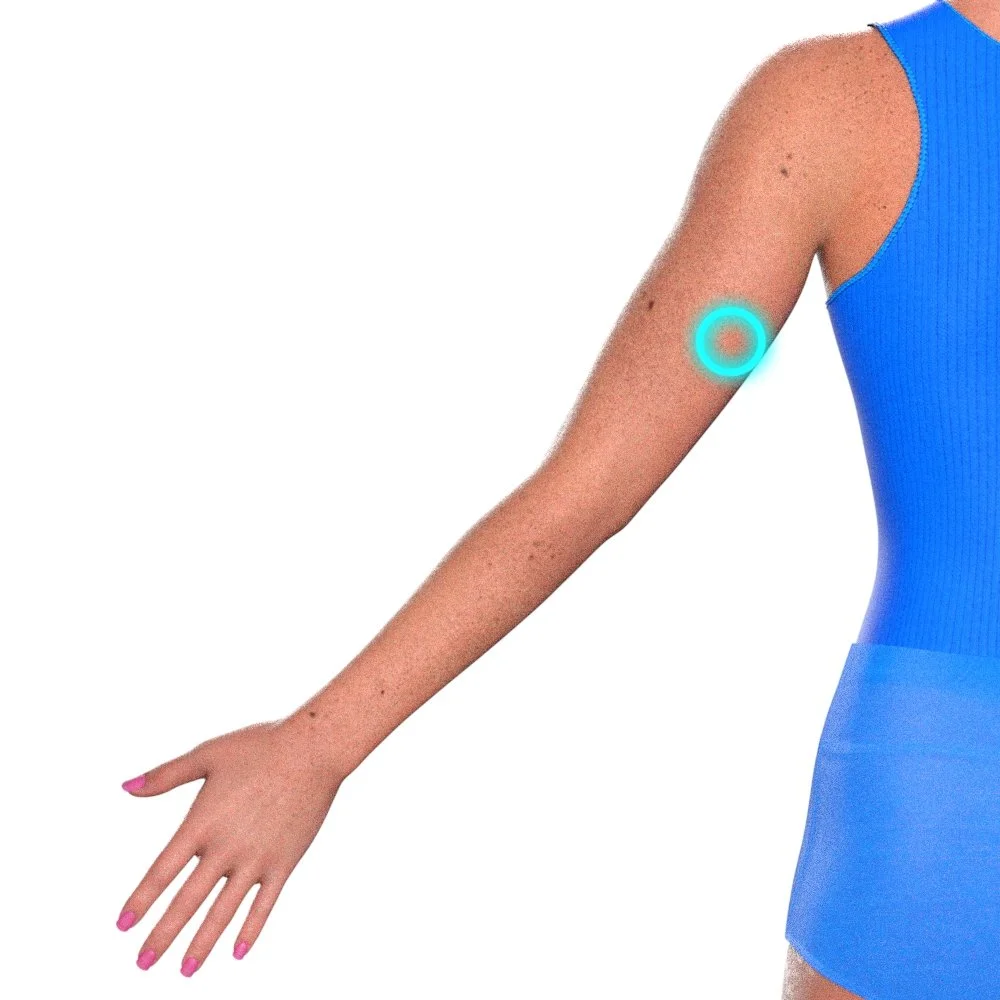 Positioning Guide: Position the PFE25™ array over the left rear upper arm, specifically over the triceps muscle on the back of the arm between the shoulder and elbow. Focus on the posterior aspect of the humeral shaft where the radial nerve travels through the spiral groove. The array can be placed on the skin or up to 1 inch away, and works effectively through clothing and other non-magnetic materials.