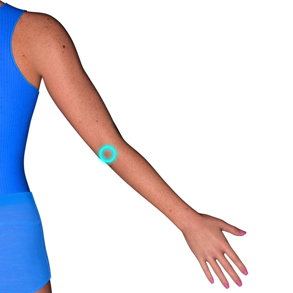 Location: Outer ElbowPurpose: Supports local radial nerve lateral branch pathways, extensor muscle fiber comfort, and lateral epicondyle nerve distribution for direct outer elbow extension function and wellness.