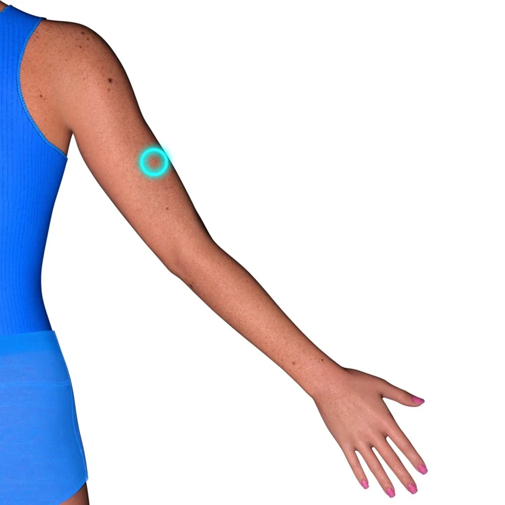 Positioning Guide: Position the PFE25™ array over the rear bicep muscle region, located on the posterior (back) side of the bicep muscle in the upper arm. This placement targets the musculocutaneous nerve posterior branches and medial brachial cutaneous nerve pathways that provide sensation and support to the posterior bicep region. The array can be placed on the skin or up to 1 inch away, and works effectively through clothing and other non-magnetic materials.