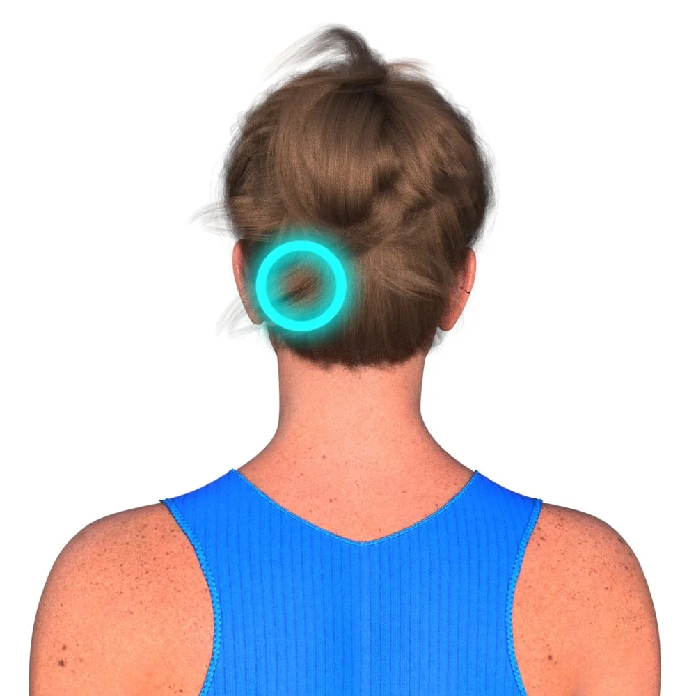 Positioning Guide: Position the PFE25™ array at the occipital center to promote left occipital muscle attachment comfort and cranial suture wellness. This placement addresses unilateral cranial muscle fiber tension and attachment points.