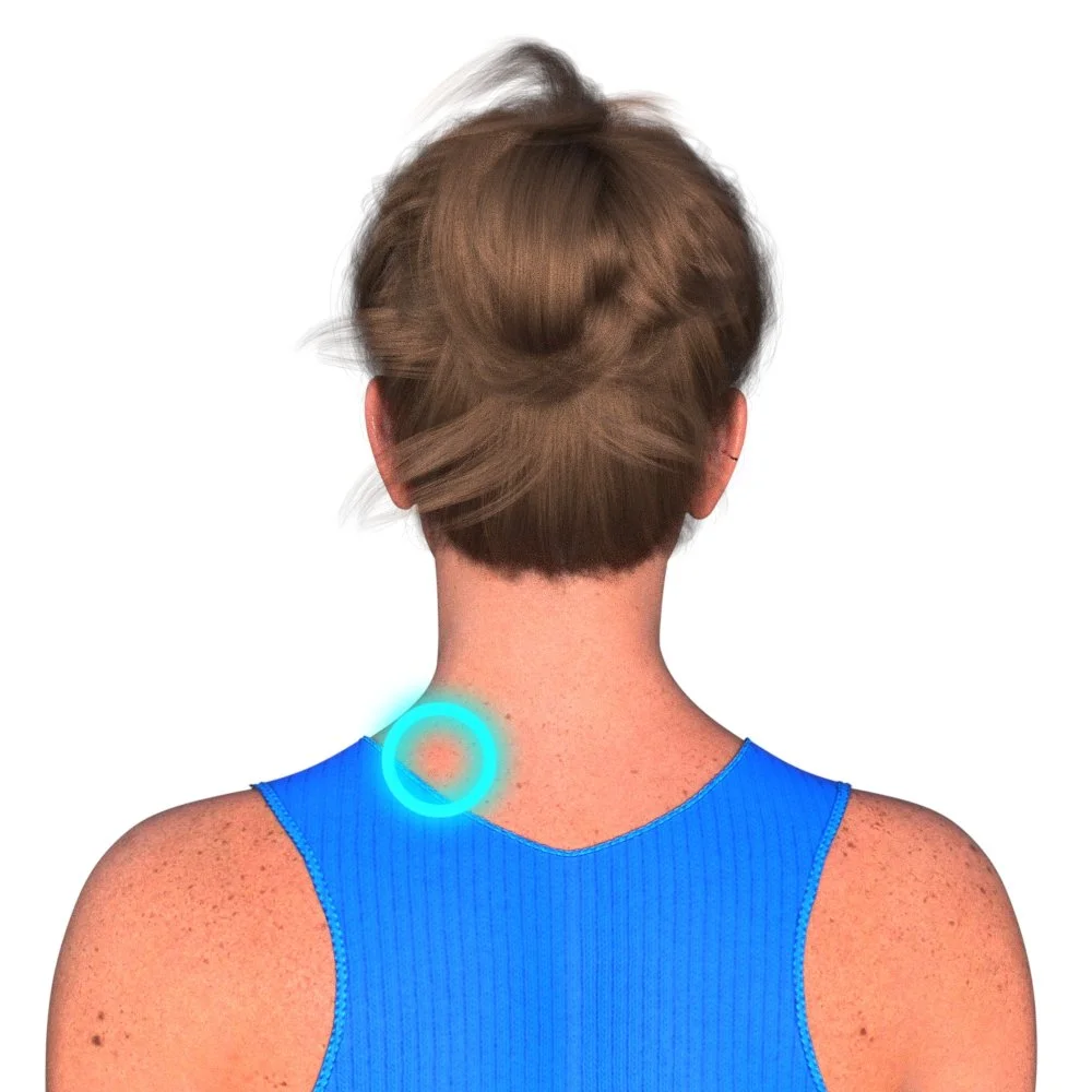 Positioning Guide: Position the PFE25™ array over the left trapezius muscle to promote muscle attachment comfort and trigger point wellness. This placement addresses muscle fiber tension and attachment points.