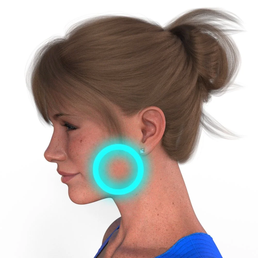 Positioning Guide: Position the PFE25™ array over the left jaw to promote persistent TMJ comfort and address chronic jaw-related patterns. This placement addresses chronic tension patterns.