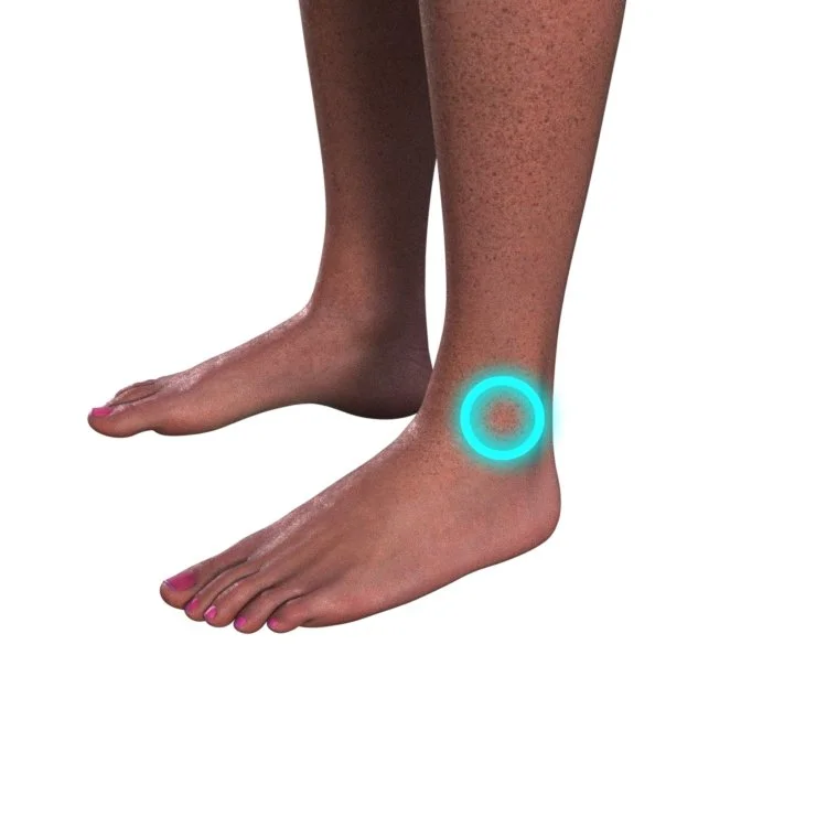 Location: Left Outer Ankle (Lateral Malleolus Region)Purpose: Supports comfort and wellness in the lateral ankle area, addressing the outer ankle region where the fibula meets the ankle joint.