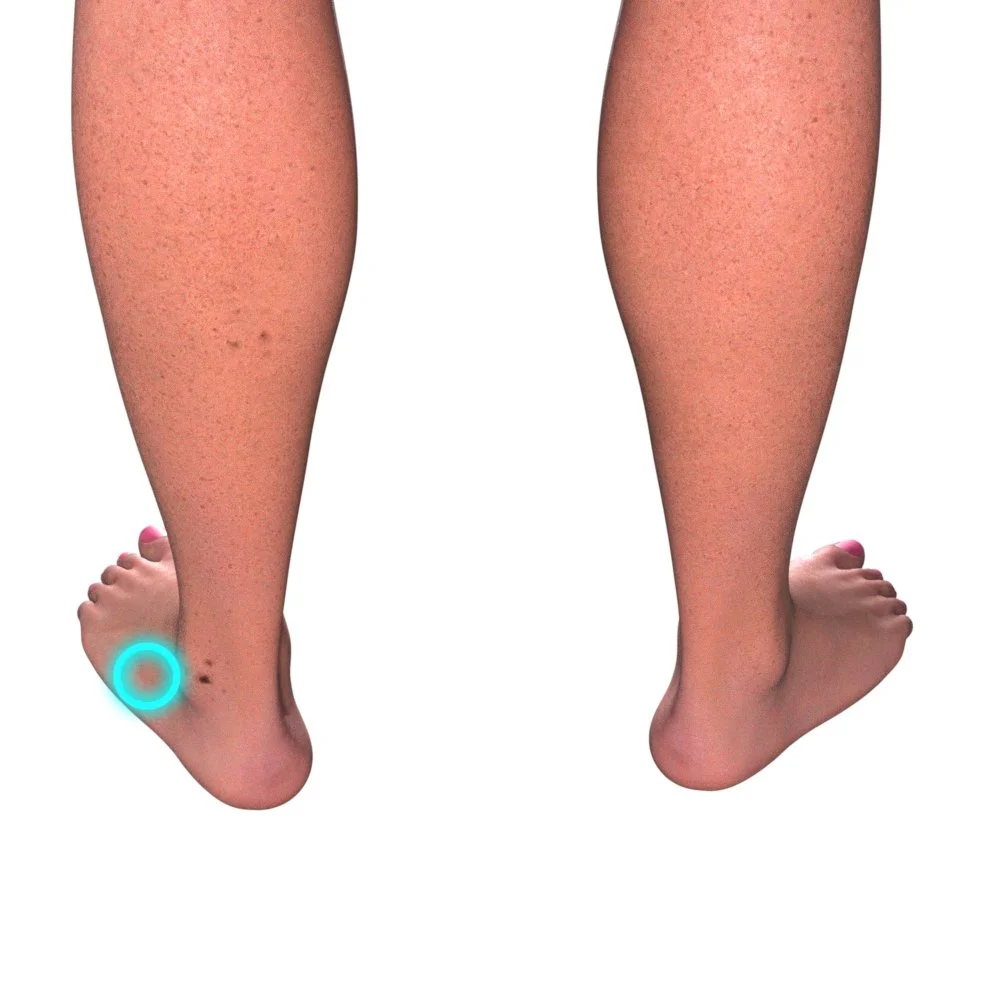 Positioning Guide: Position the PFE25™ array over the left top outer foot region, targeting the lateral foot structures and peroneal nerve pathways. The array can be placed on the skin or up to 1 inch away, and works effectively through clothing and other non-magnetic materials. This placement addresses the dorsal foot muscles, lateral foot bones, and peroneal nerve distribution for optimal lateral foot comfort.
