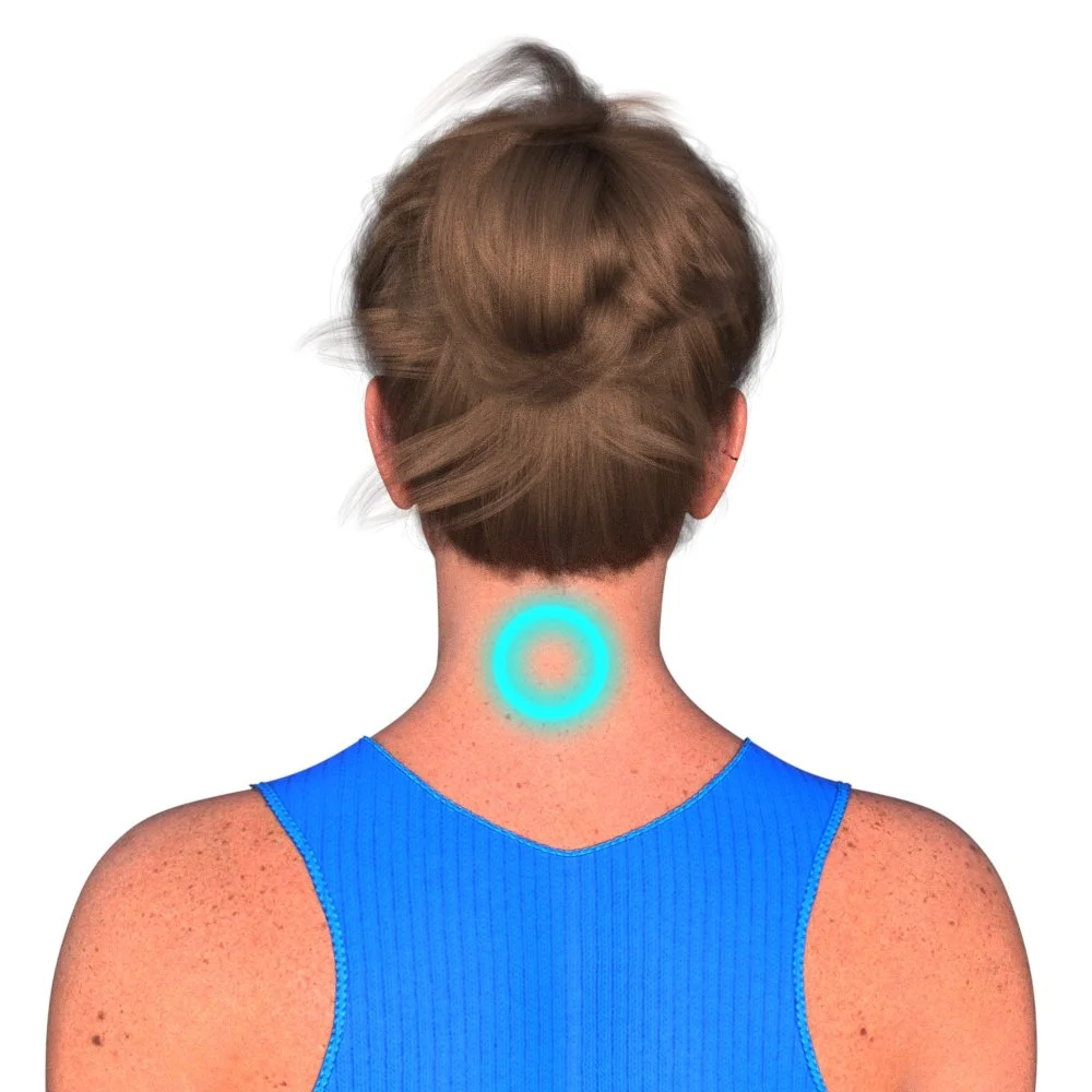Positioning Guide: Position the PFE25™ array over the center of the C4 vertebra, located at the mid-neck level approximately 4 vertebrae down from the base of the skull. This central cervical placement focuses on the fourth cervical vertebra for optimal neck stability and vertebral mechanics support. The array can be placed on the skin or up to 1 inch away, and works effectively through clothing and other non-magnetic materials.