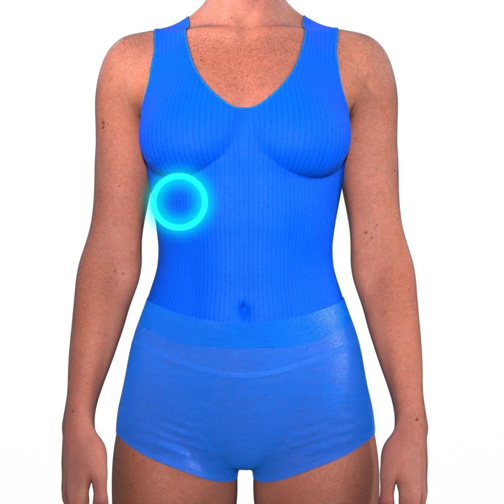 Positioning Guide: Position the PFE25™ array over the right lower ribcage area, covering the lower intercostal spaces and costal margin region. The array can be placed on the skin or up to 1 inch away, and works effectively through clothing and other non-magnetic materials. This placement addresses the intercostal muscles and costal cartilage structures for optimal rib wellness support.
