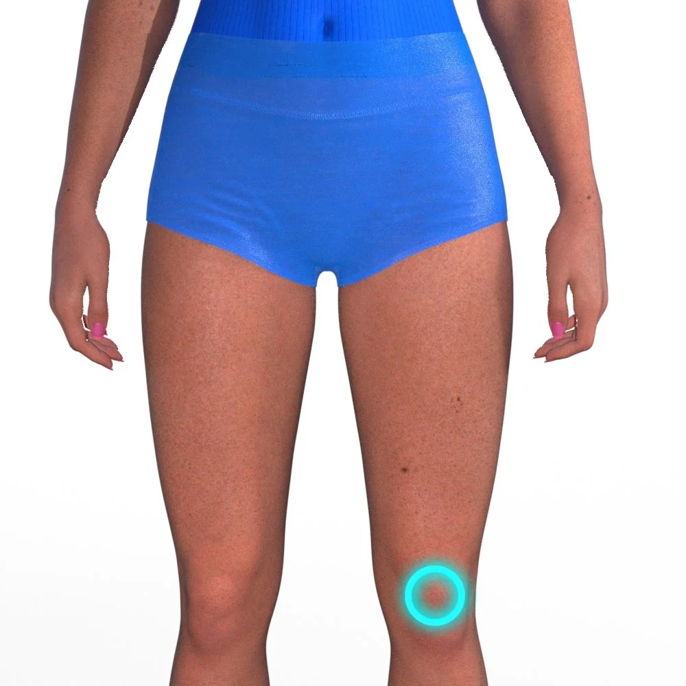 Location: Left Upper Thigh (femoral nerve area)Purpose: Engages femoral nerve pathway support for comprehensive knee wellness and quadriceps function.