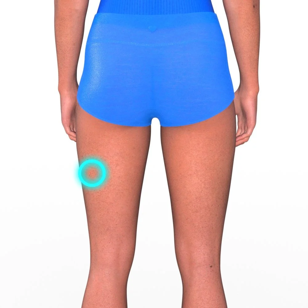 Positioning Guide: Position the PFE25™ array at the L5 vertebra level on the lower back, approximately at the level of the top of the hip bones (iliac crests). This targets the L5 nerve root level and lateral femoral nerve pathway continuation that control lateral thigh function, creating comprehensive nerve pathway support for IT band wellness integration.